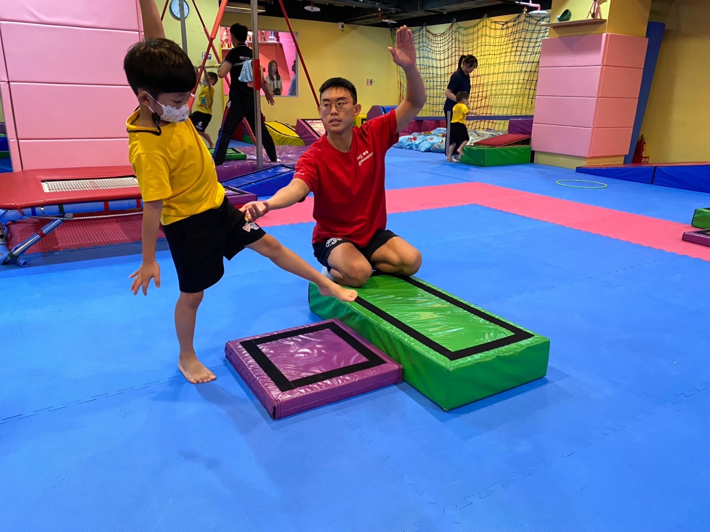 運用平衡木、彈簧床、單槓、地板等器材,設計各種體操動作組合,強化孩子的平衡感、靈敏度與感覺統合能力。透過肌肉與骨骼的鍛鍊,提升身體控制能力,為進入更進階體操課程打下良好基礎